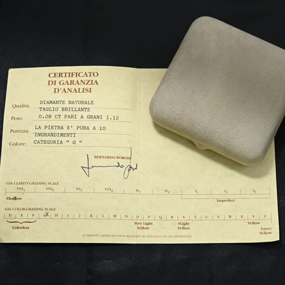 イタリア ヴァレーゼにある「ベルナルド・ボルギ」という宝石商。品質(Qualit?):天然ダイヤモンド、ブリリアントカット重さ(Peso):0.28カラット(1.12グレインに相当)透明度(Purezza):10倍の拡大率で「PURE」(純粋)と評価されています。GIAクラリティ・グレーディングスケールでは「Flawless」(フローレス)に相当します。色(Colore):カテゴリー「G」と記載されており、GIAカラー・グレーディングスケールではほぼ無色に近い範囲に位置します。署名:ベルナルド・ボルギ氏の署名があります。